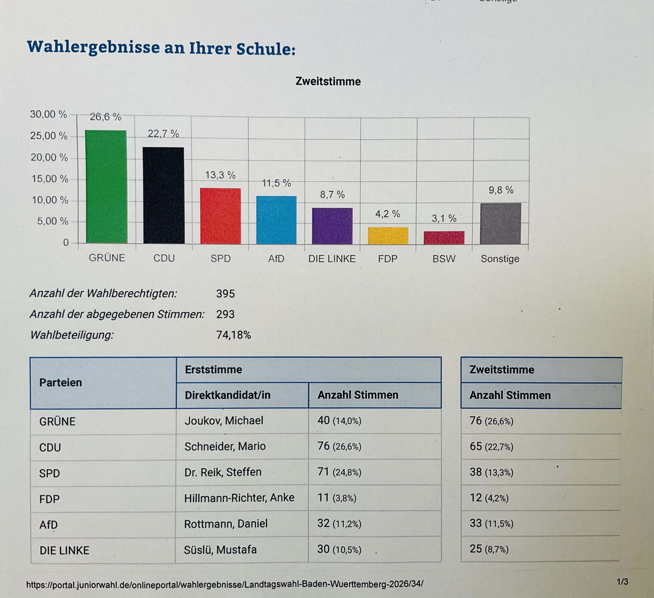 Und das ist das Wahlergebnis der Juniorwahl zur Landtagswahl am Anna-Essinger-Gymnasium