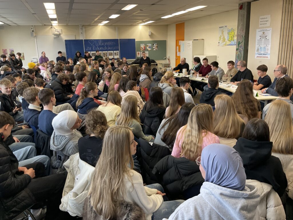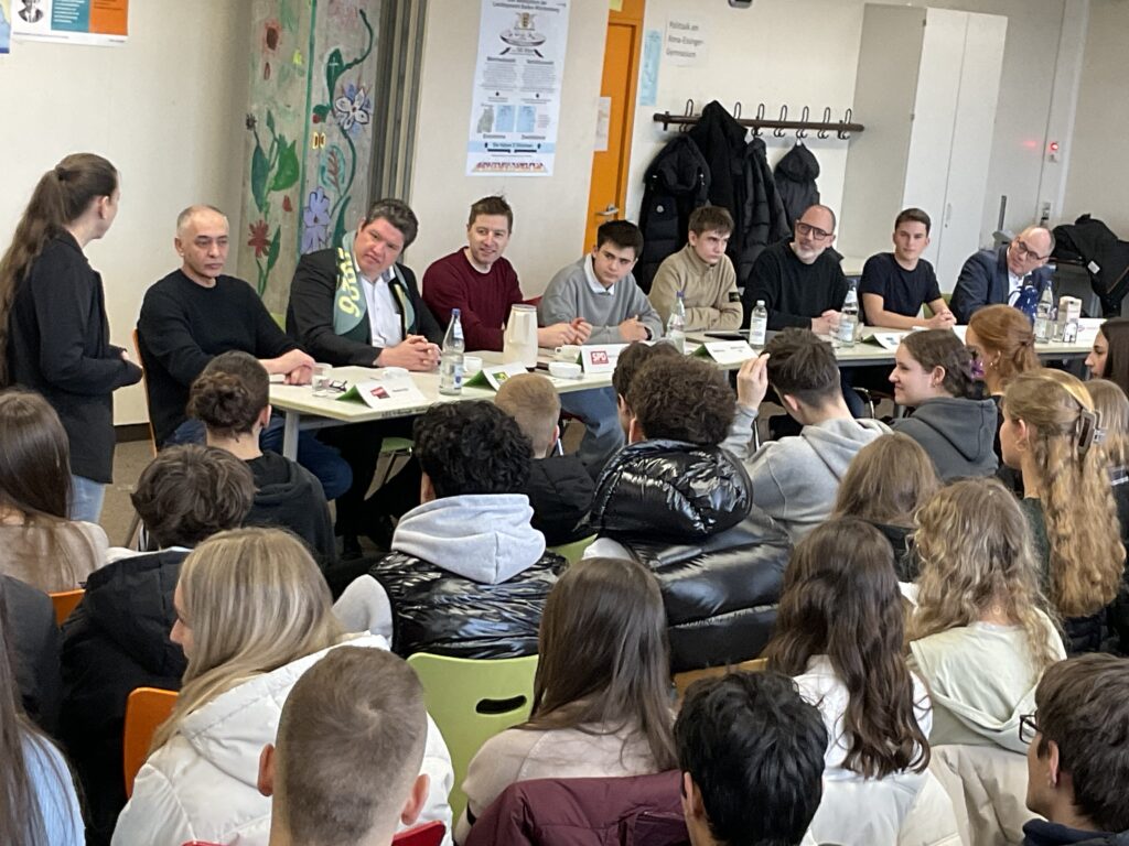Mittlerweile ist es schon Tradition am Anna-Essinger-Gymnasium: SchülerInnen der Politik-AG organisieren und moderieren eine Podiumsdiskussion vor Wahlen. Zum Polittalk luden dieses Jahr Benjamin Schuler (10g) und Marko Jurjevic (10g). Gekommen sind fast alle Wahlkreiskandidaten. Siehe Foto. Ein ausführlicher Artikel folgt.